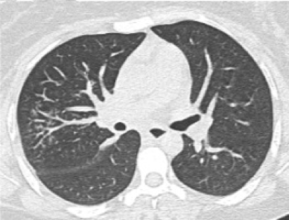a) Día 3 después de la aparición de síntomas: afectación del parénquima pulmonar en forma de consolidaciones multifocales bilaterales, subpleurales.